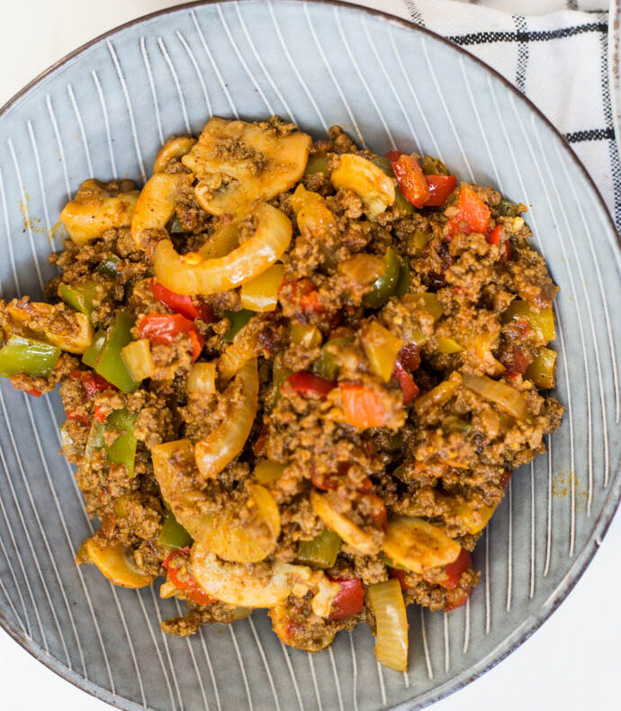 gehakt (halal) | knoflook | kurkuma | paprikapoeder | komijnpoeder | ui ringen | paprika | champignons | tomaten | chilisaus | cheddar